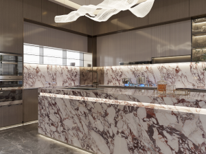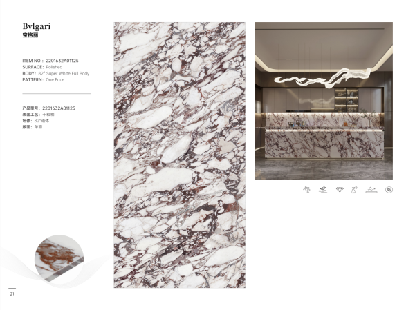 The BVLGARI Sintered Stone Panel exudes grandeur and sophistication, inspired by fine Italian marble. Its bold burgundy and white veining creates a luxurious ambiance in hotels, lobbies, and premium residences. Resistant to heat, stains, and scratches, it offers unparalleled performance for heavy-use areas. Perfect for feature walls, vanities, or designer kitchens, it merges artful beauty with engineering precision — a showpiece surface that elevates any interior.